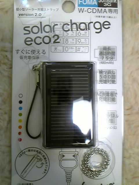 なんとソーラー充電器です。普通にコンセントでも充電でき、携帯バッテリーとしても利用出来ます。携帯依存症の私にとっては、予備のバッテリーを充電して持ち歩く(実際にやってたw)より便利なので、いい買い物をしました。